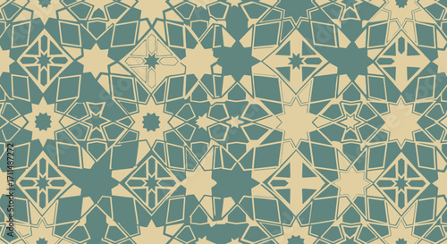Ornamental Seamless Pattern Featuring Geometric Shapes in Teal and Beige, Ideal for Textile Prints, Backgrounds, and Digital Design Projects