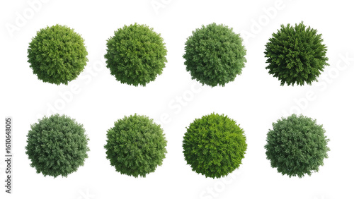 Ornamental shrubs topiary garden plants in diverse green tones on isolated transparent stage