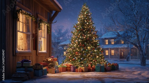 ornamentdecorated evergreen tree twinkling lights presents underneath januarys chill adds to the festive scene holiday season cold celebration