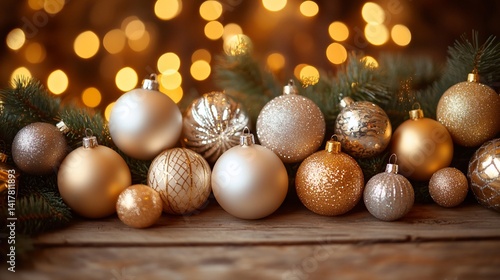 Ornaments adorn wood surface; festive lights illuminate holiday decoration