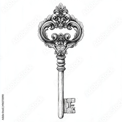 Ornate antique key illustration, detailed silver key with decorative swirls and flourishes.