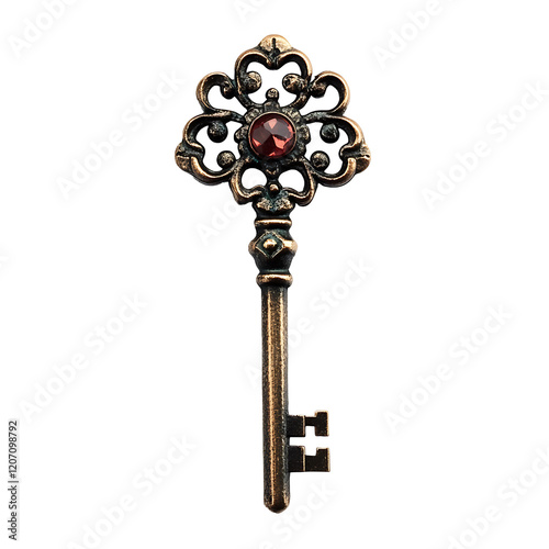 Ornate antique key with ruby gemstone.