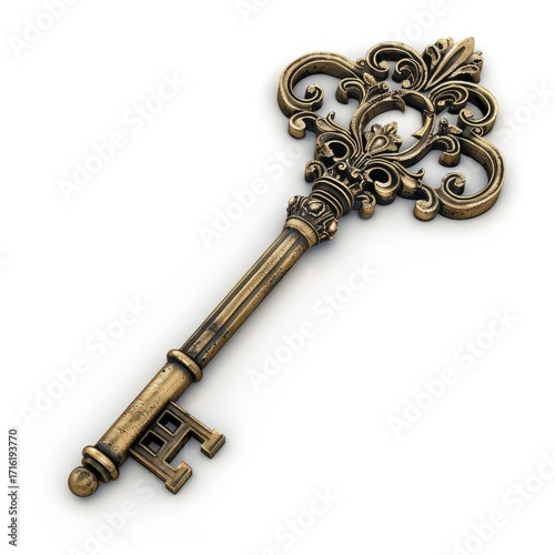 Ornate, antique-style key with a large, detailed head and fluted shaft, rendered in a bronze or gold tone against a white background