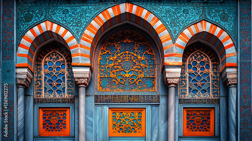 Ornate architectural facade featuring intricate designs and vibrant colors.