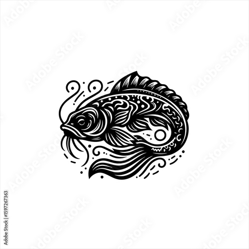 Ornate Black and White Koi Fish Illustration.