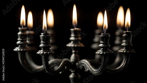 Ornate black candle holder with burning candles.