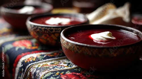 Ornate bowls of beet soup, with a dollop of cream, rest on a richly patterned tablecloth, evoking tradition and warmth.