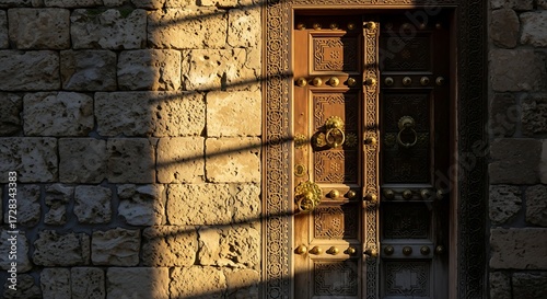 Ornate Brown Door on Stone Wall with Shadow Patterns Exterior