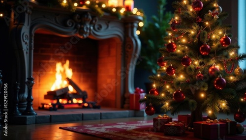 Ornate Christmas tree against roaring fireplace flames, christmas tree, fire, lights
