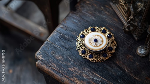 Ornate decorative brooch on wooden table