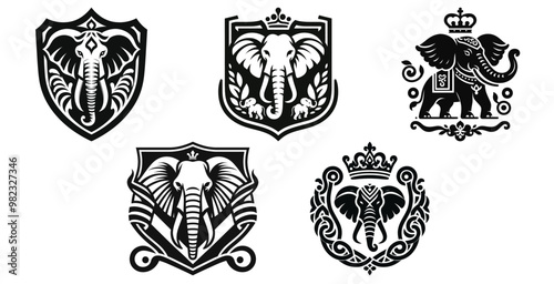 Ornate elephant shield emblems black and white vector illustration symbolizes royalty and strength