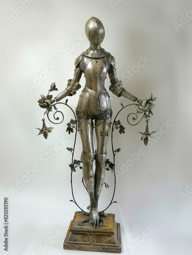 Ornate Female Knight Armor Statue with Floral Decorations in a minimalist room with white walls, medieval figure
