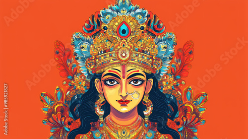 Ornate figurine of hindu deity in colorful traditional costume and headdress. Traditional Costume. Illustration