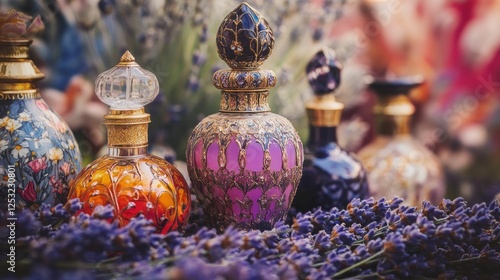 Ornate glass bottles, lavender, floral background.