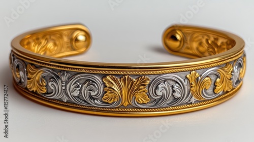 Ornate gold and silver cuff bracelet with intricate floral carvings.