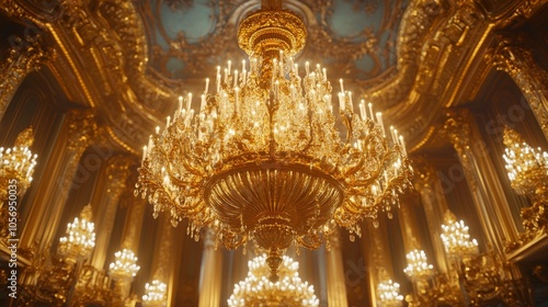 Ornate Gold Chandelier with Crystal Accents in a Gilded Interior