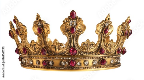 Ornate gold crown adorned with red and clear gemstones, isolated on white background.