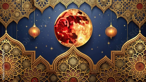 Ornate Golden Archways Frame a Fiery Celestial Body, Illuminated by Hanging Lanterns Against a Night Sky