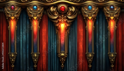 Ornate Golden Candelabras with Red and Blue Curtains