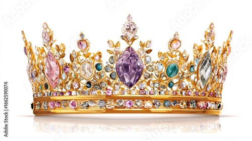 Ornate golden crown adorned with various jewels, casting a soft reflection