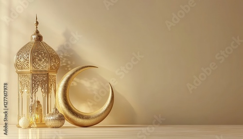 Ornate Golden Lantern and Crescent Moon on Beige Background