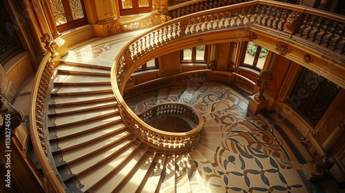 Ornate Golden Spiral Staircase in a Luxurious Mansion