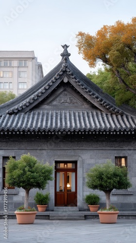 Ornate Gray Temple Roof Sculptures With Myt Symbols And Decorative Architectural Details Set Against A Soft Sky With Autumn Trees And Lush Greenery In The Foreground