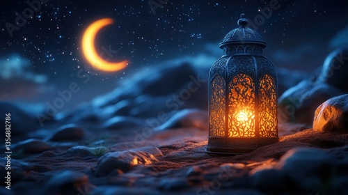 Ornate lantern glows on rocky terrain under crescent moon night sky