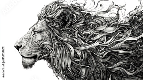 Ornate Lion Profile, Windswept Mane, White Background, Art Print