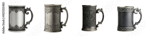 Ornate metal mugs, cups, tankards, and steins in a classic style