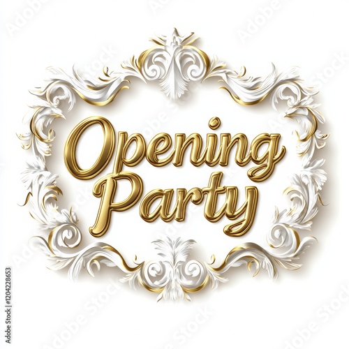 Ornate "Opening Party" text in gold surrounded by decorative white flourishes on a clean white background. Ideal for invitations, events, and celebration-themed visuals.