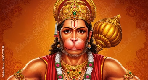 Ornate portrait of a monkey-faced deity in jewelry, facing forward on an orange patterned background