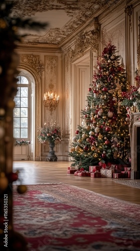 Ornate room with large decorated Christmas tree, presents, and antique details.
