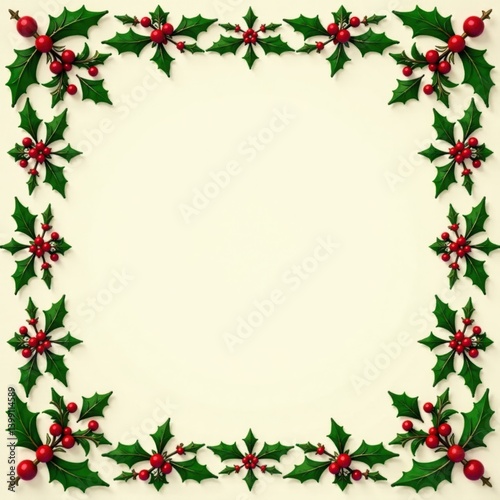 Ornate snowflake border adorning a festive holly-inspired background, greenery, decorations