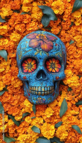 Ornate sugar skull rests on a bed of vibrant marigolds, a striking Day of the Dead tribute.