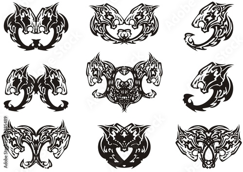 Ornate symbols created from tiger head and eagle element. Abstract double symbols formed by tiger head and eagle element for tattoos, prints, embroidery, engraving, textiles, etc.