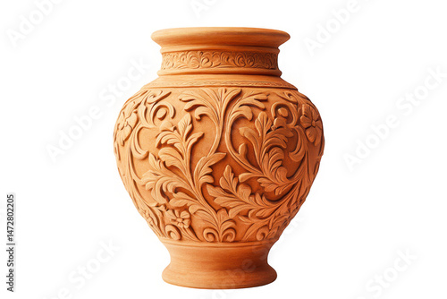 Ornate terracotta vase with floral carvings isolated on transparent background