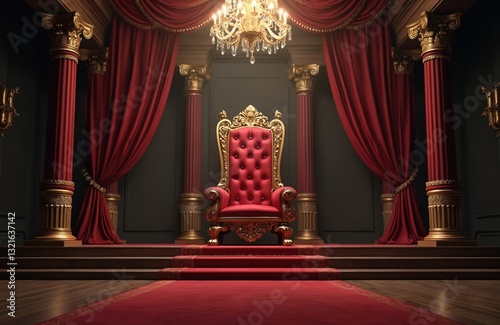 Ornate throne room with red velvet chair. Luxurious interior with golden columns, chandelier, steps, carpet. Regal palace setting evokes power, elegance. Backdrop for royalty, historical drama,