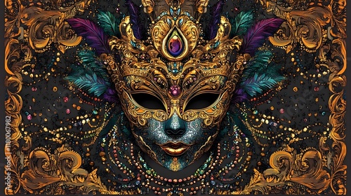 Ornate Venetian Carnival Mask with Vibrant Feathers and Intricate Patterns