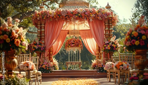 Ornate wedding mandap decorated with flowers and drapes, traditional setting