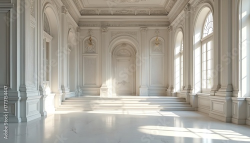 Ornate white room with architectural details. Sunlight streams through arched windows creating shadows. Elegant interior features columns moldings, arches. Photo perfect for design projects, luxury