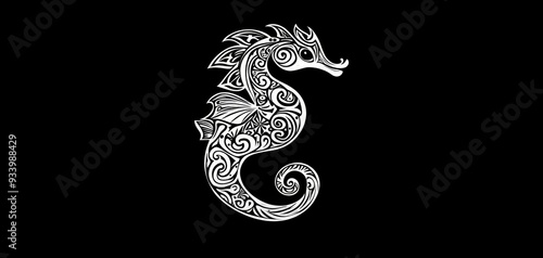 Ornate White Seahorse Silhouette on Black Background Intricate Design Minimalist Composition Elegant Aquatic Artwork
