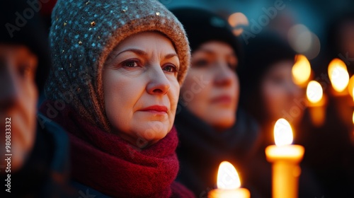 Orthodox Christmas vigil with worshippers holding beeswax candles, bathed in the warm glow of numerous small oil lamps