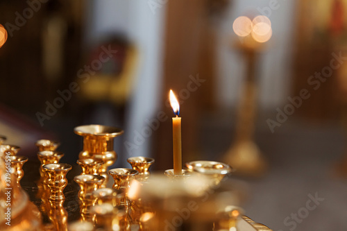 Orthodox Church. Christianity. Festive interior decoration with burning candles and icon in traditional Orthodox Church on Easter Eve or Christmas. Religion faith pray symbol.