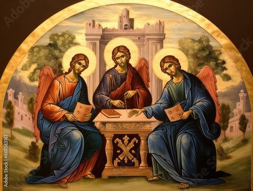 Orthodox icon The Old Testament Trinity style, oil illustration AI