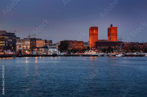 Oslo Skyline mit Rathaus bei Sonnenuntergang
