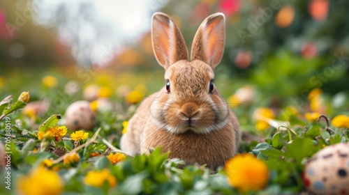 Osterhase auf einem Blumenfeld mit warmen Licht