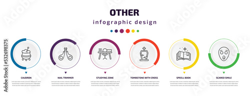 other infographic element with icons and 6 step or option. other icons such as caudron, nail trimmer, studying zone, tombstone with cross, speell book, scared smile vector. can be used for banner,