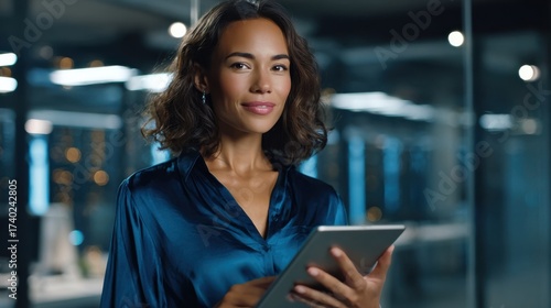 oung woman holding digital tablet in a high-tech environment. Embracing innovation.