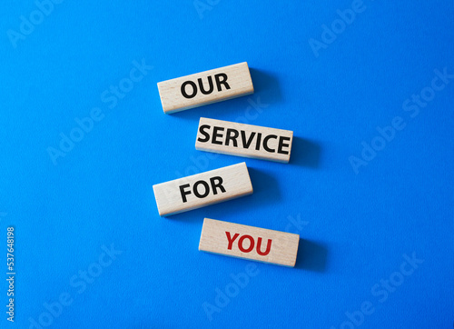 Our service for you symbol. Wooden blocks with words Our service for you. Beautiful blue background. Business and Our service for you concept. Copy space.